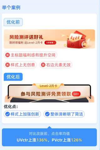 例如以下案例,优化后的素材对比优化前的素材,在形态上更具有吸睛效应,让人一眼就能看到。行动按钮更突出,让人更有点击欲望。图案元素更加具有表意性,让人一眼看懂是什么意思。