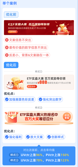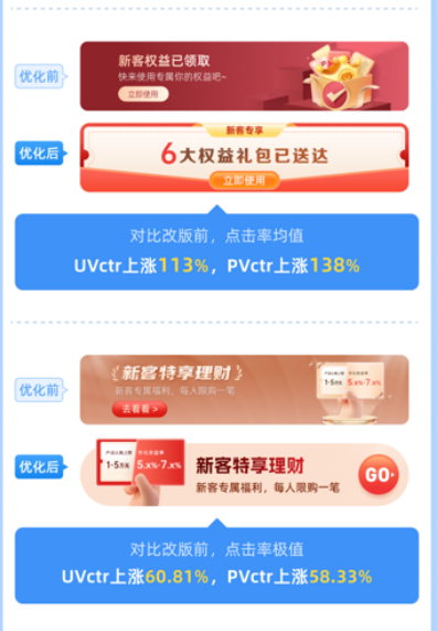 例如,以下案例,减少了无效元素,强化了福利感,以及样式上加强创新,整体更加简洁清晰明了,使得点击率得到了显著的提升。